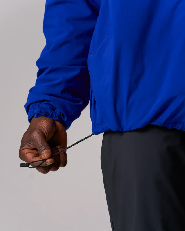 The jacket features a hood, a full zippered front, zippered pockets at the waist, and a hidden liner pocket on the back left side. Additional features include underarm zips that run from hem to elbow, adjustable elastic hem, and elastic ribbing at the cuffs, hem, and hood.