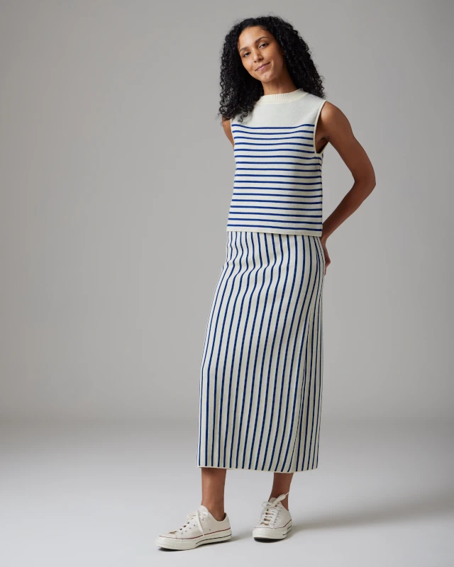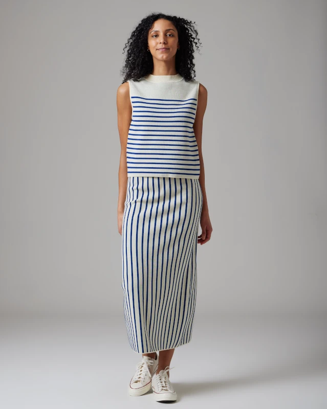 The Cotton Nylon Skirt is designed to fit close to the body with the hem hitting at the ankle. We recommend taking a size up from your normal size for a Slim fit. The model stands 5’10 and wears size 2.