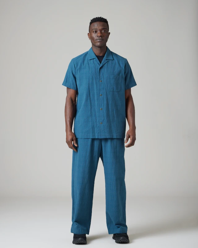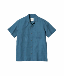 The Cotton Polyester Check Shirt is a breathable seersucker button-down. The shirt is made of lightweight cotton and recycled polyester for cool and dry wear. The Cotton Polyester Check Shirt features a collar, button closure, and straight hem.
