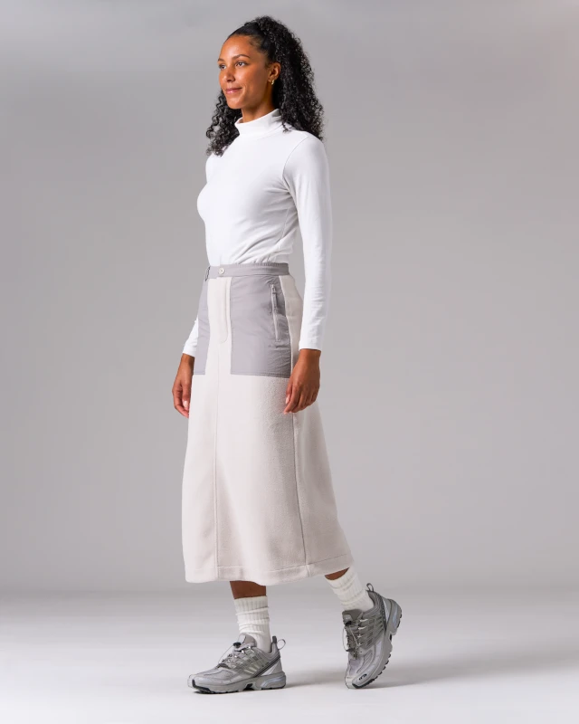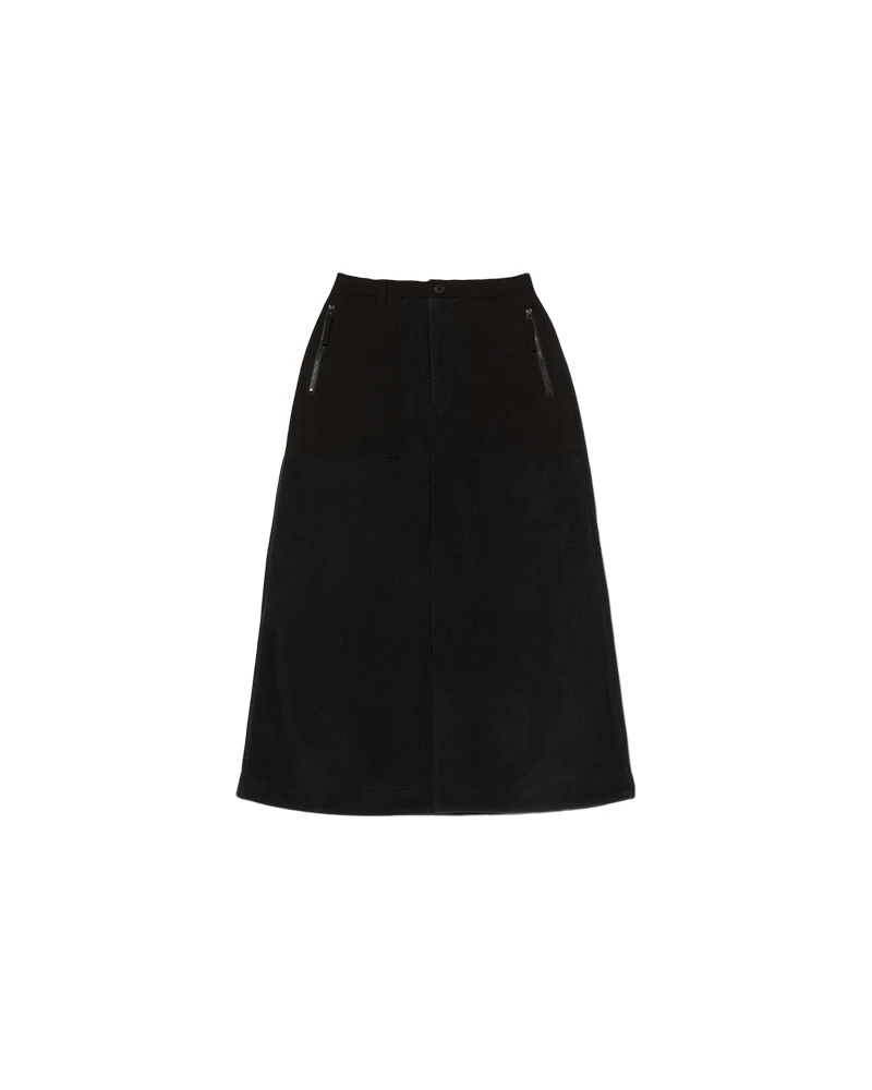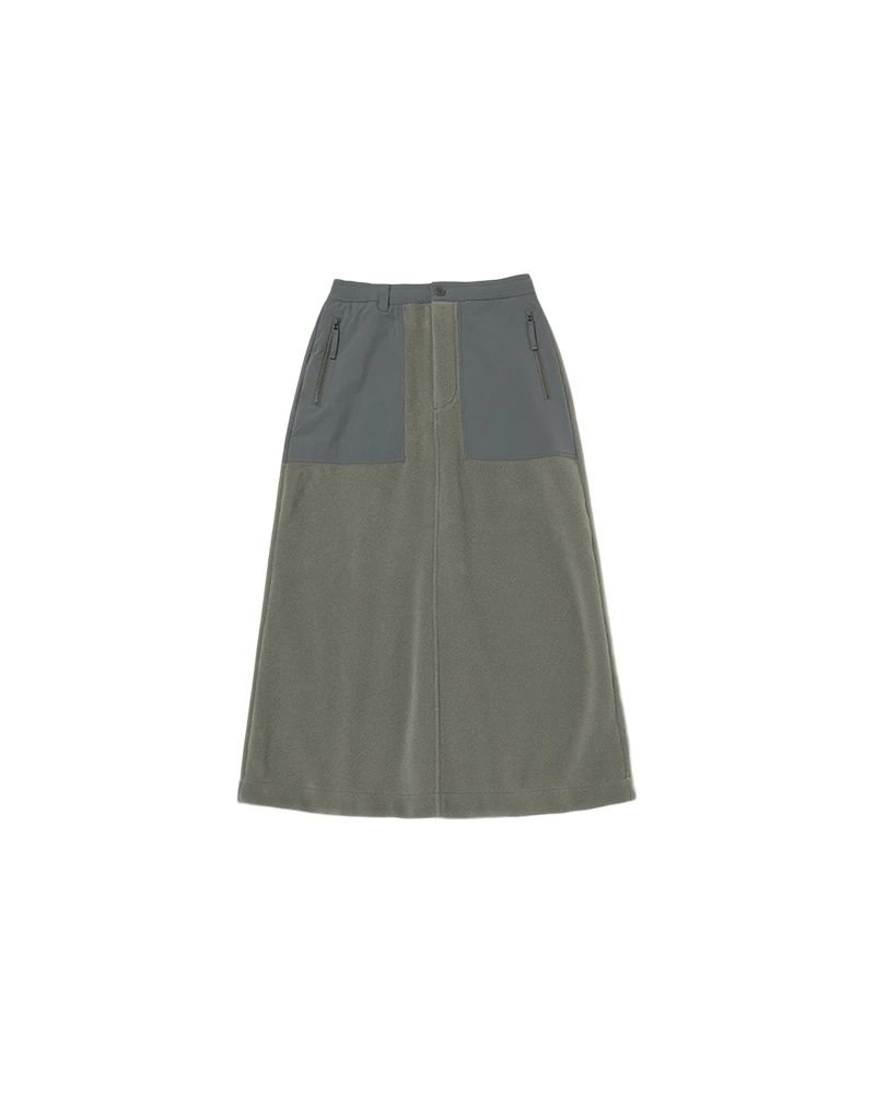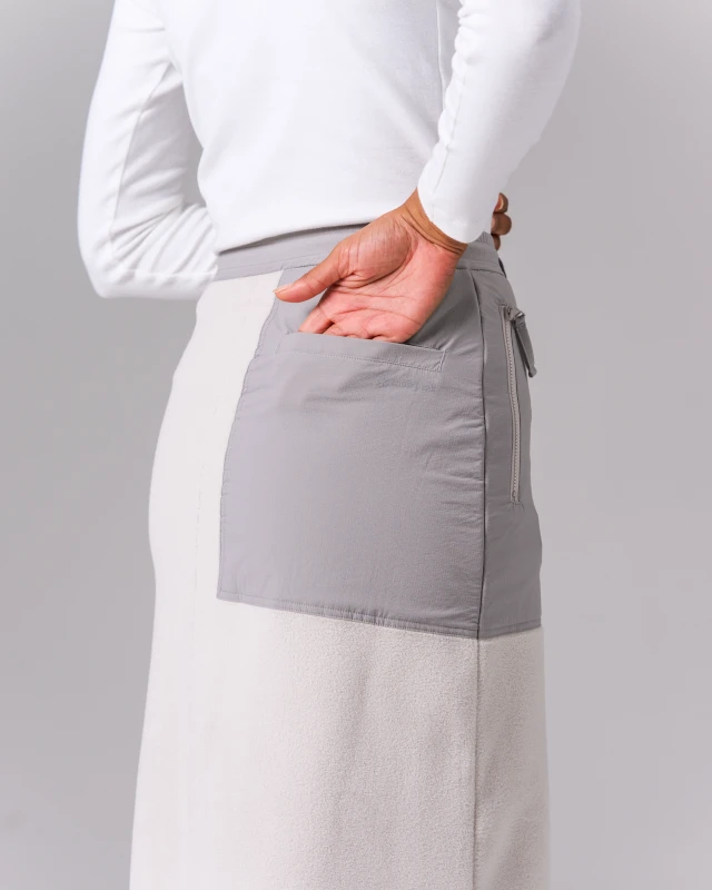 The Double Face Fleece Skirt is a thick, lightweight fleece bottom. The skirt is made from Polartec 200 Series Fleece, with stretchable polyester panels on the face and lining. The skirt features an A-line design, button and zipper closure at the front, stretchable sections through the waist and hip, two zippered pockets at the waist, and a zippered back pocket.