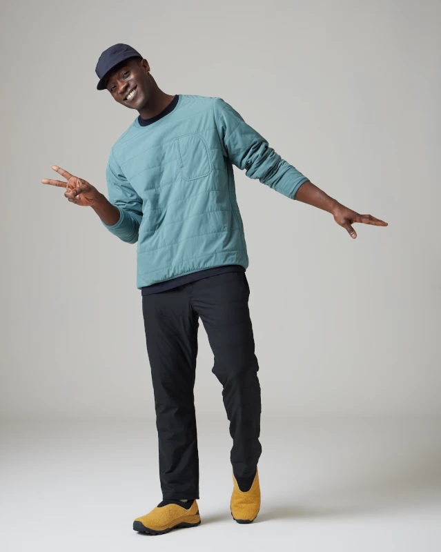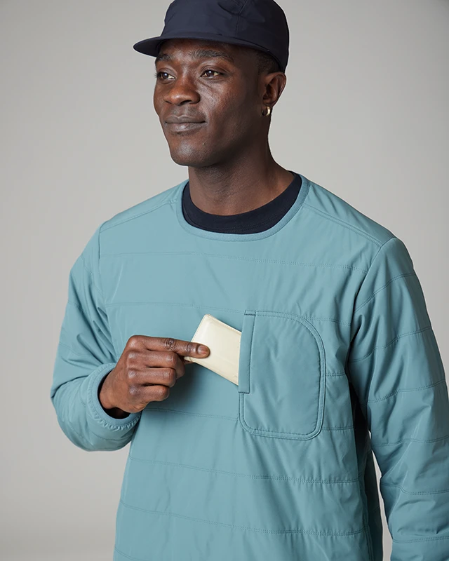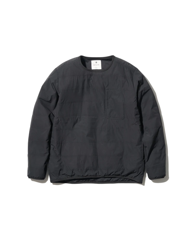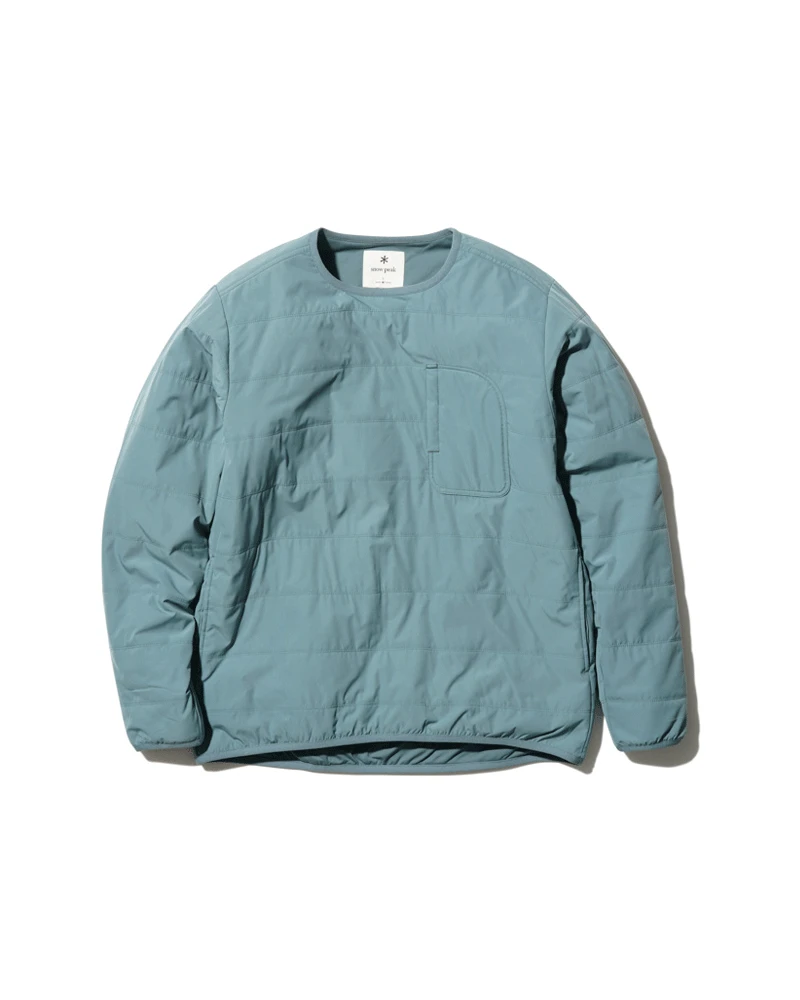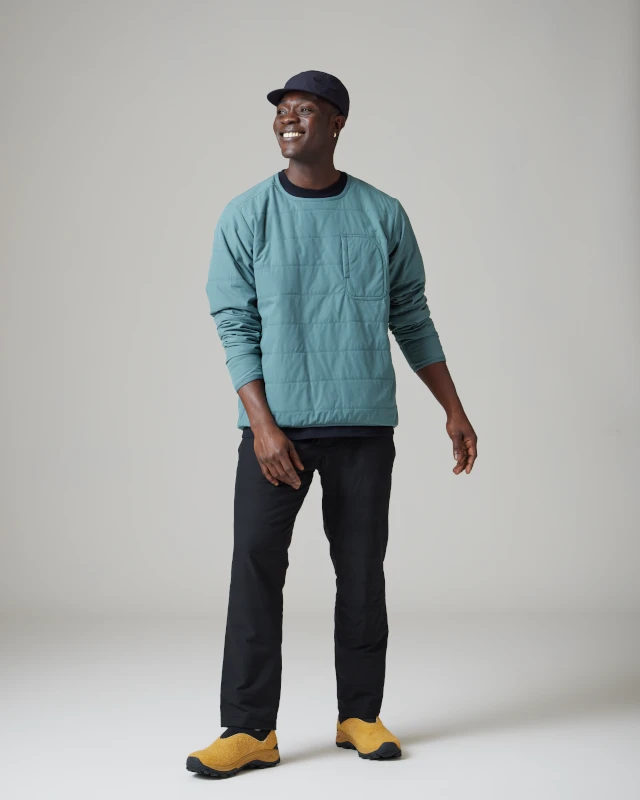 The Flexible Insulated Pullover is a lightweight quilted crewneck. The pullover is made of recycled polyester and Primeflex material with a durable stretch and a water-repellent finish. The pullover features a crewneck, a left chest pocket, and two pockets at the waist.