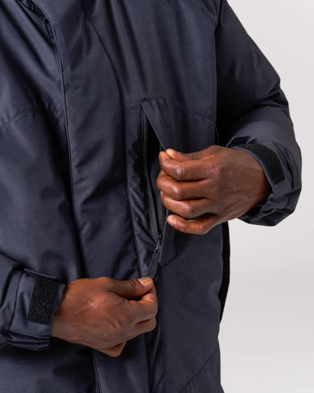 The Fire-Resistant 2 Layer Down Coat is a durable, insulated long coat. The coat offers wind resistance, water resistance, and fire resistance from recycled ripstop polyester and aramid fabric. The Fire-Resistant 2 Layer Down Coat has an adjustable hood, dual waist pockets, a double zippered and buttoned front, and a drawcord at the hem.