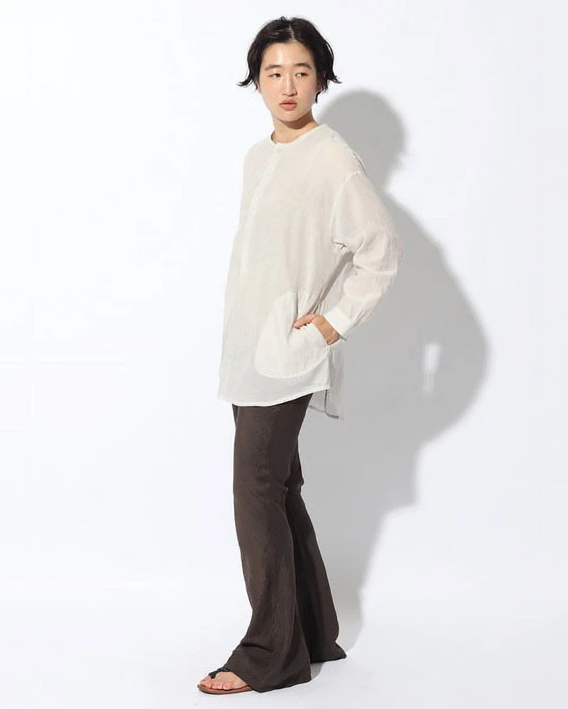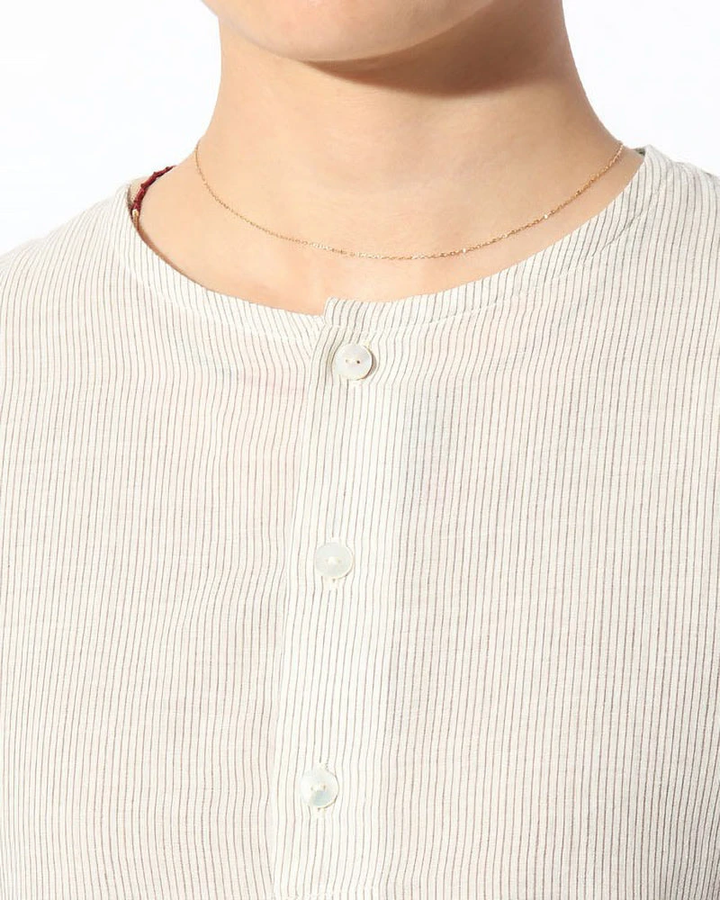 The Hand-Woven Pinstripe Sleeping Shirt is a textured tunic shirt. The shirt is made of hand-woven 100% cotton with delicate pinstripes. It features a collarless neck, henley buttons, long sleeves, and dual pockets at the hem.