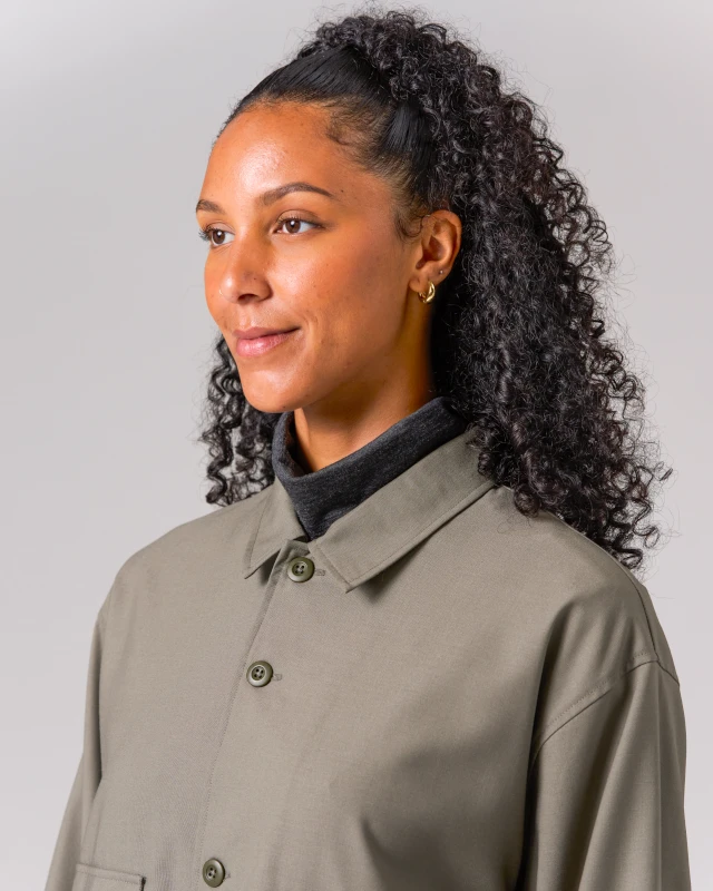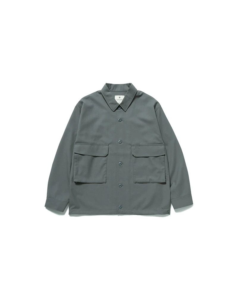 The Hybrid Wool Shirt is a collared button-up shirt made from a polyester wool blend. This blend enhances the insulating and moisture absorption properties of wool and the lightweight, quick-drying properties of polyester. The shirt features a folded collar, buttoned front, and buttoned cuffs. There are two large flap pockets on the front, with a hidden zip-closure pocket on the back.