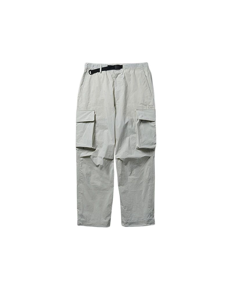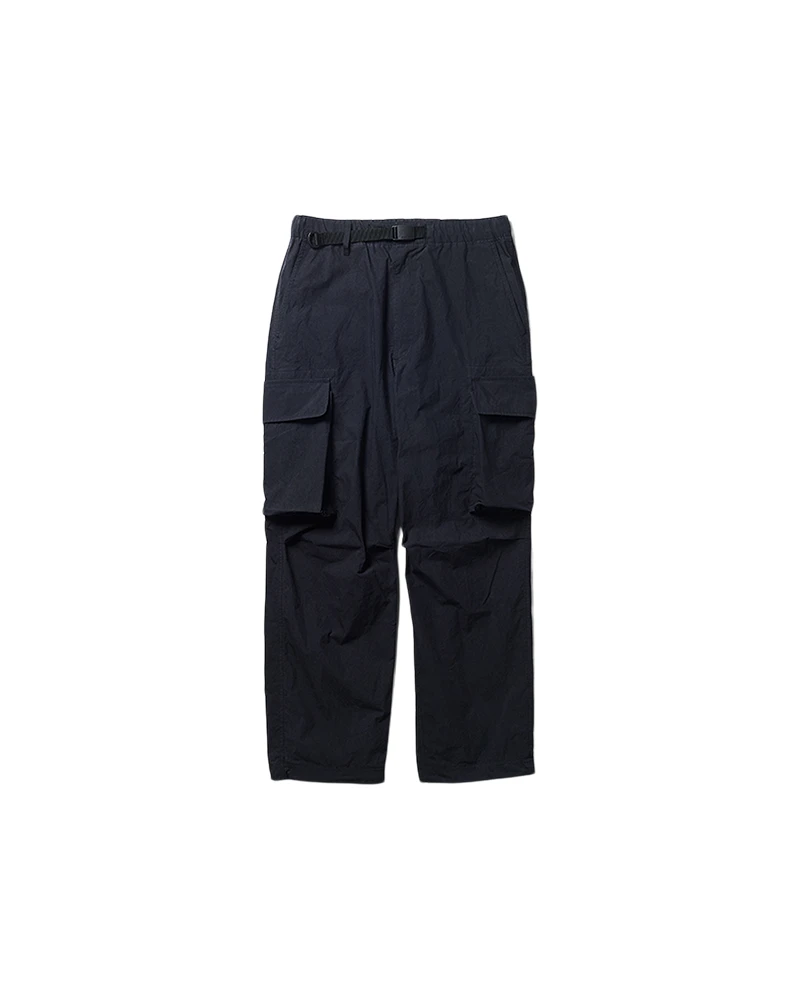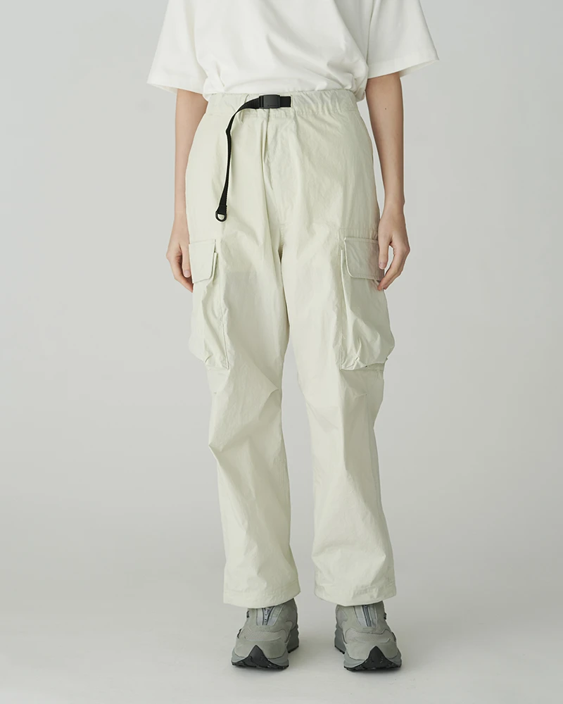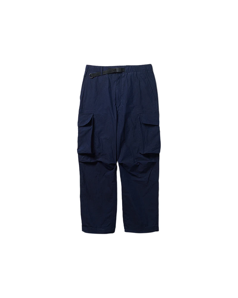 The Indigo C/N Pants are lightweight cargo pants. The pants feature an integrated belt with a D-ring, two angled pockets at the waist, two slit pockets on the back, double cargo pockets on both thighs, and elastic spindle adjusters at the hem. The fabric is lightweight and paper-like to the touch while retaining the natural texture of cotton.