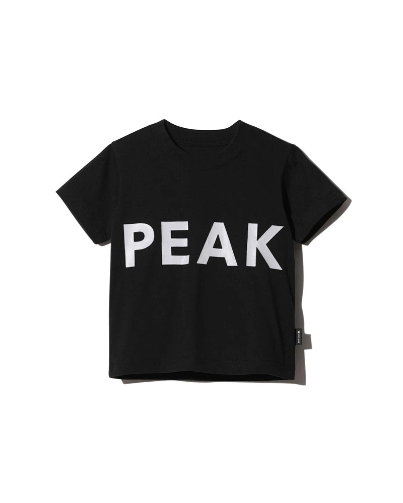 The Kids Reflective Printed T-Shirt is a quick-drying top. The fabric is made of cotton, recycled polyester, and has a reflective print of “Peak” on the front and “Snow” on the back. The shirt features a crew neck, short sleeves, and printed chest and back.