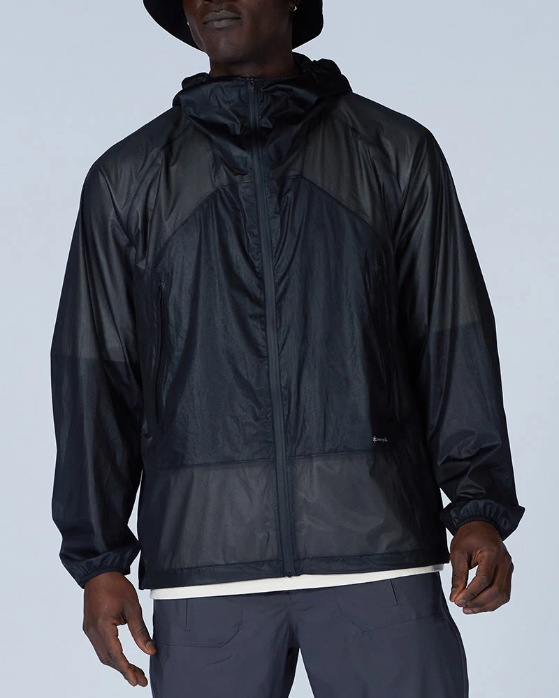 The Light Packable Rain Jacket is designed to fit close to the body. We recommend taking your normal size for a standard fit. The model stands 6′ and wears size L.