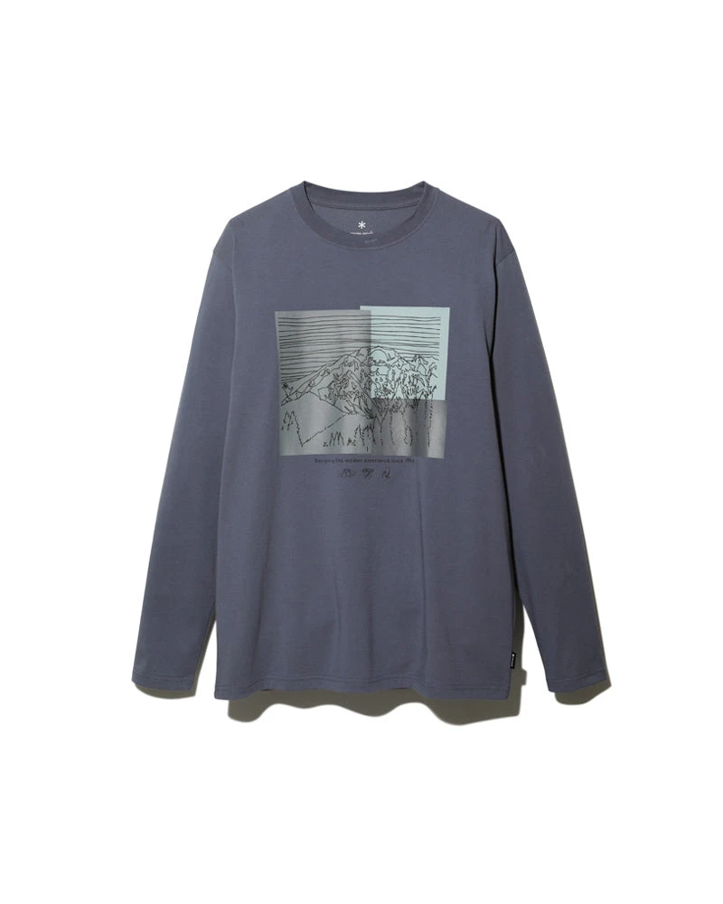 The Mt. Echigo Komagatake Long Sleeve T-Shirt is a printed wrinkle-resistant top. The shirt is a blend of organic cotton and recycled polyester. It features a crewneck, long sleeves, graphic print of Mt. Echigo Komagatake, and a straight hem.