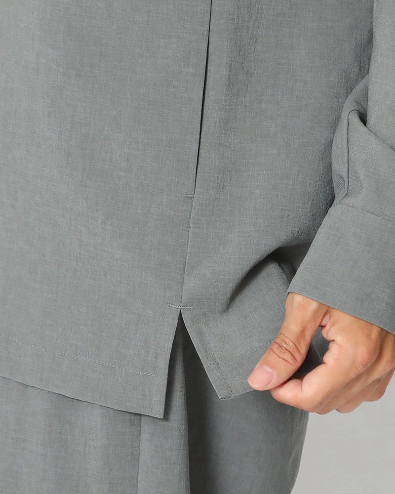 The Polyester Light Poplin Shirt is an antibacterial breathable top. The fabric has a stretchy crepe texture and is made of polyester. The Polyester Light Poplin Shirt features a collar, full button closure, long sleeves, upper back vent, and dual side pockets at the waist. Pair the Polyester Light Poplin Shirt with the