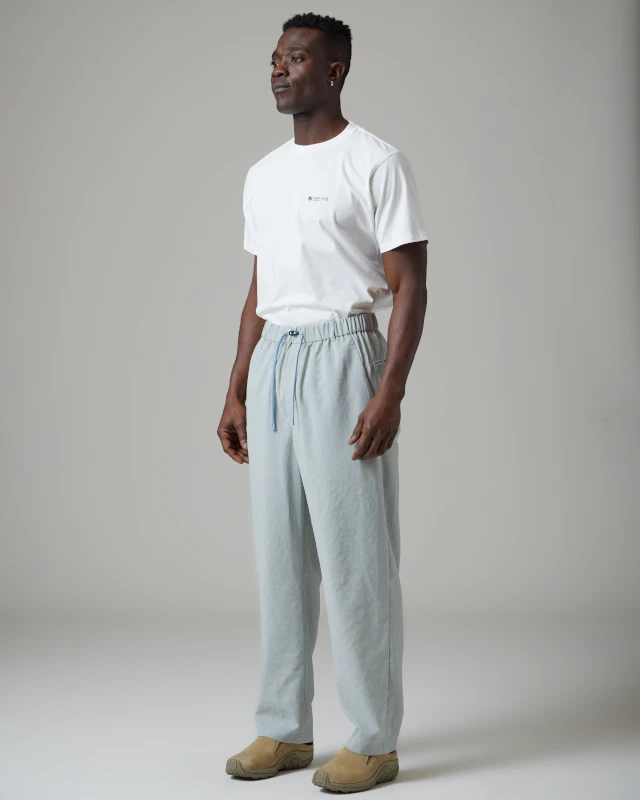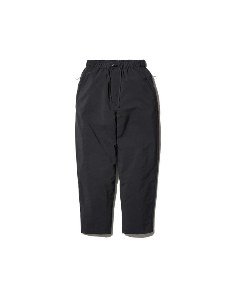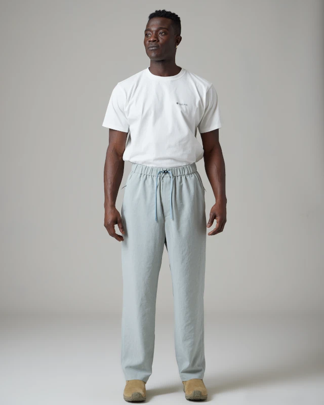 The Polyester Poplin Pants are lightweight, quick-dry, and breathable bottoms. The fabric has a stretchy crepe texture and is made of recycled polyester. The pants feature an elastic waistband with a drawcord, single button closure, dual side and back pockets, and straight leg opening.