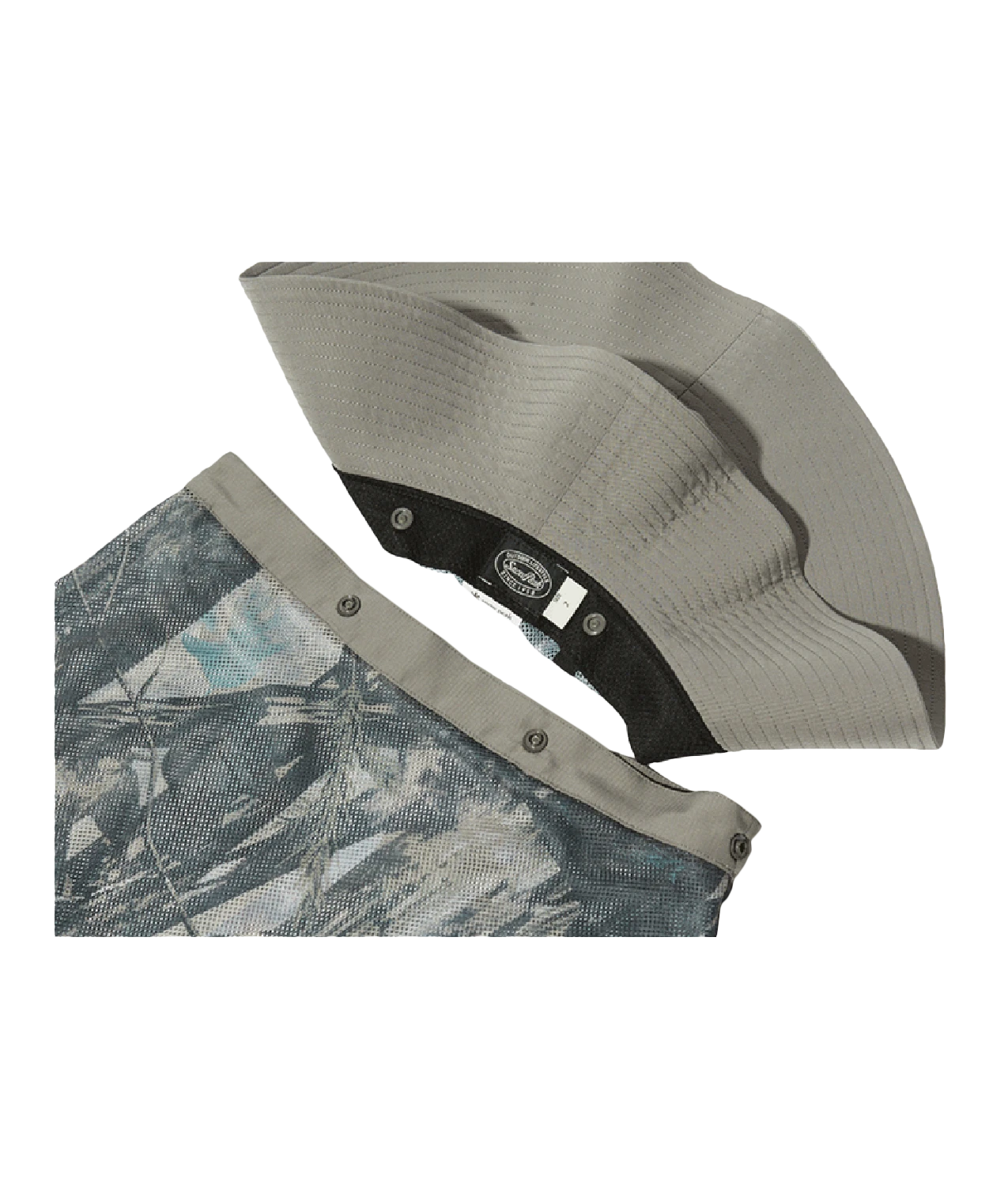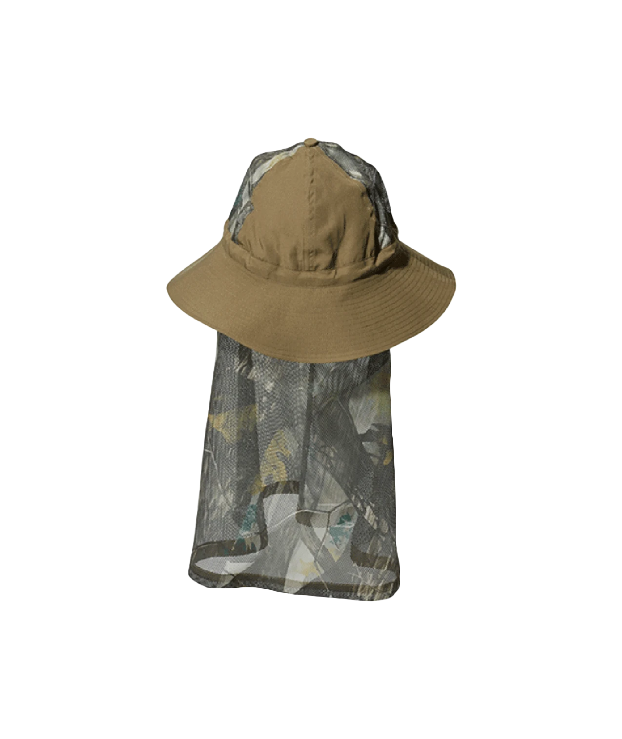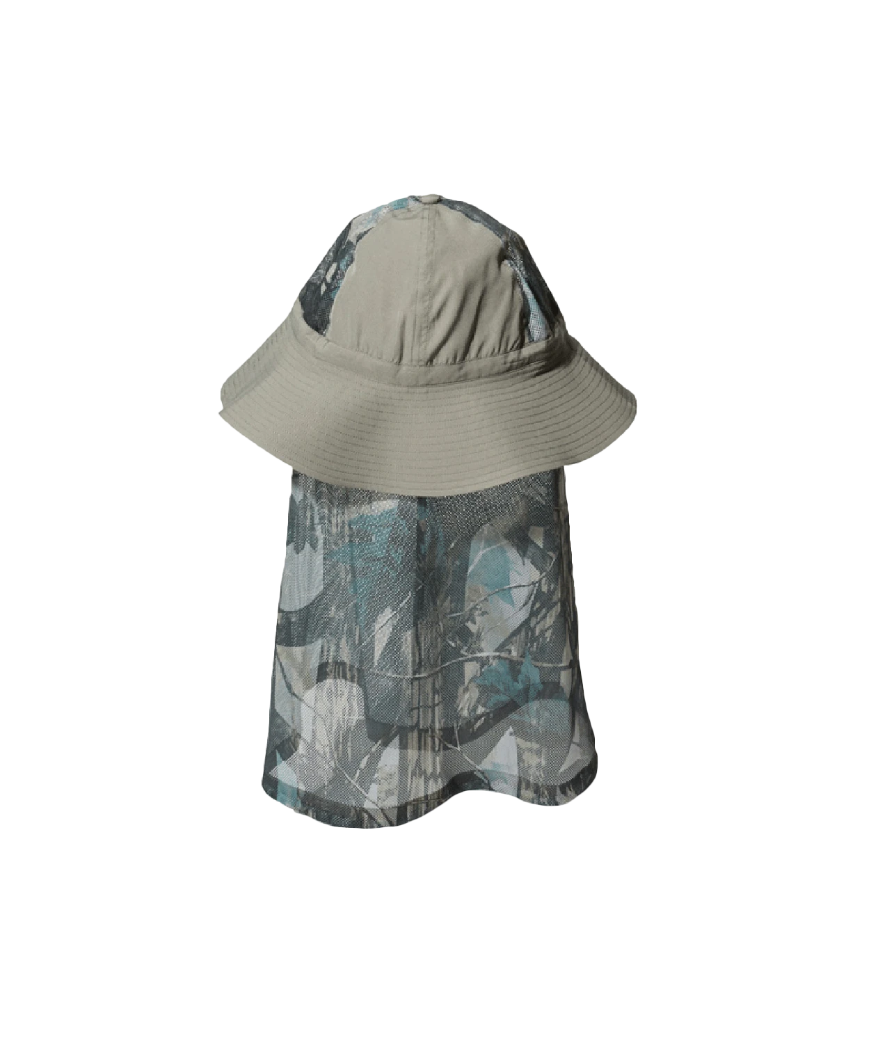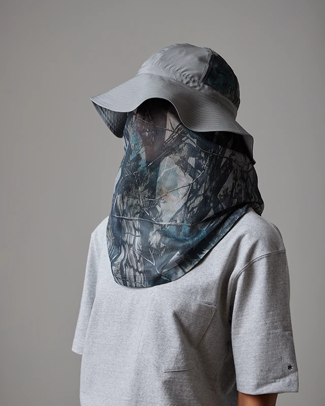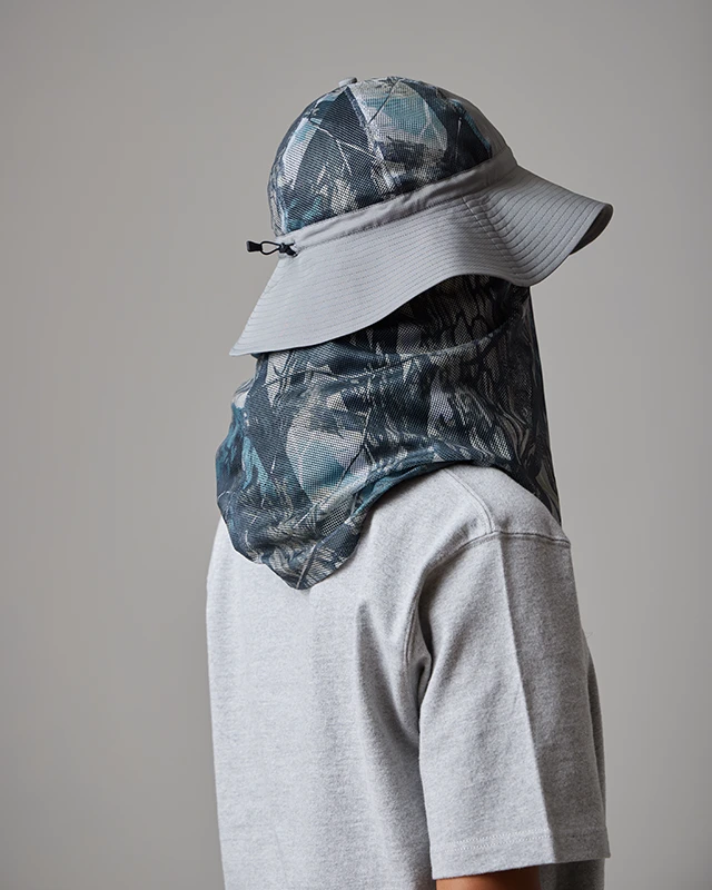 The Printed Insect Shield Hat is a versatile insect-repellent bucket hat with a neck cape. The fabric is made of breathable 100% recycled polyester. The hat features six crown panels, a wide brim, a drawcord, and a removable mesh cape.
