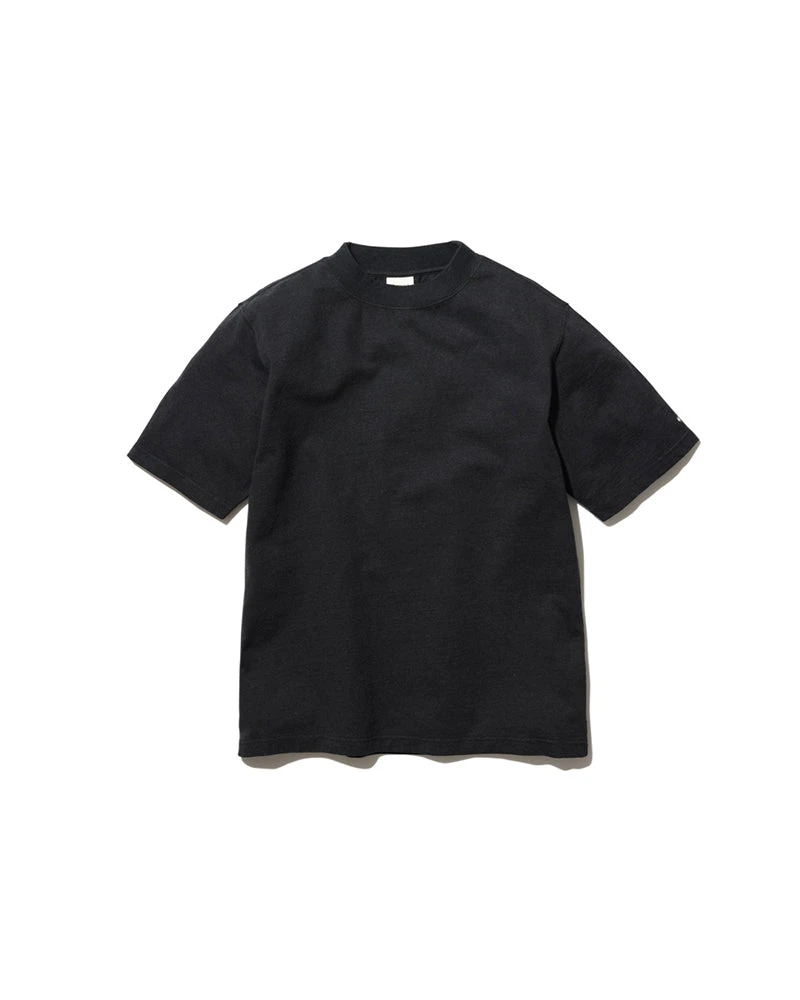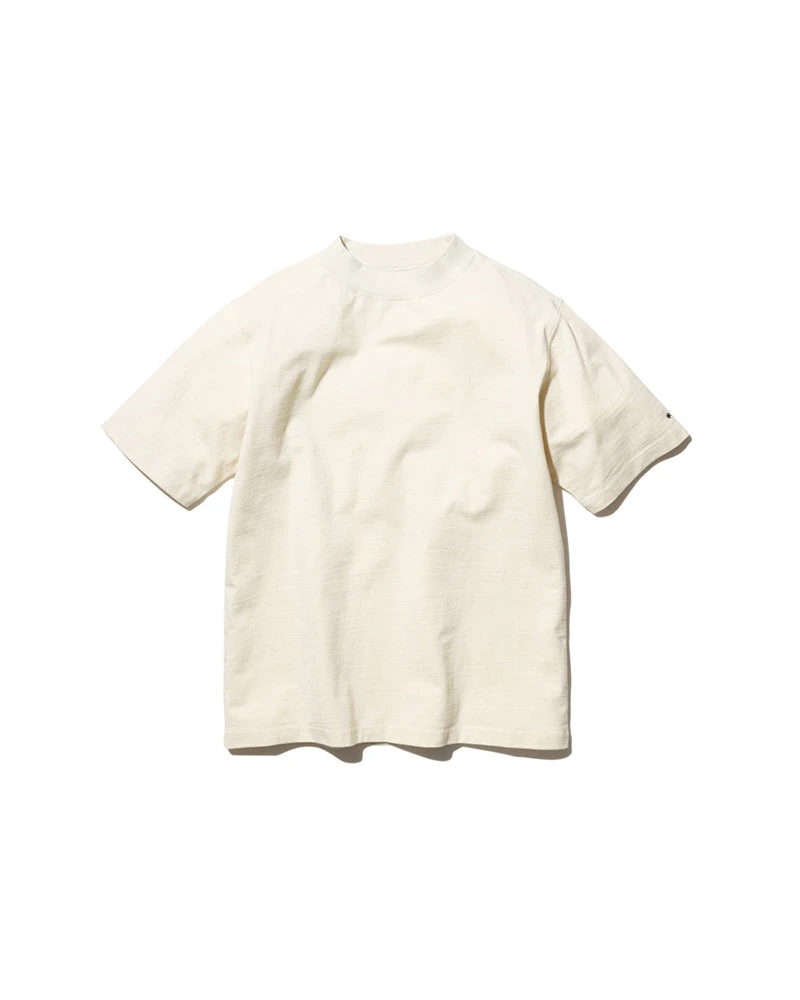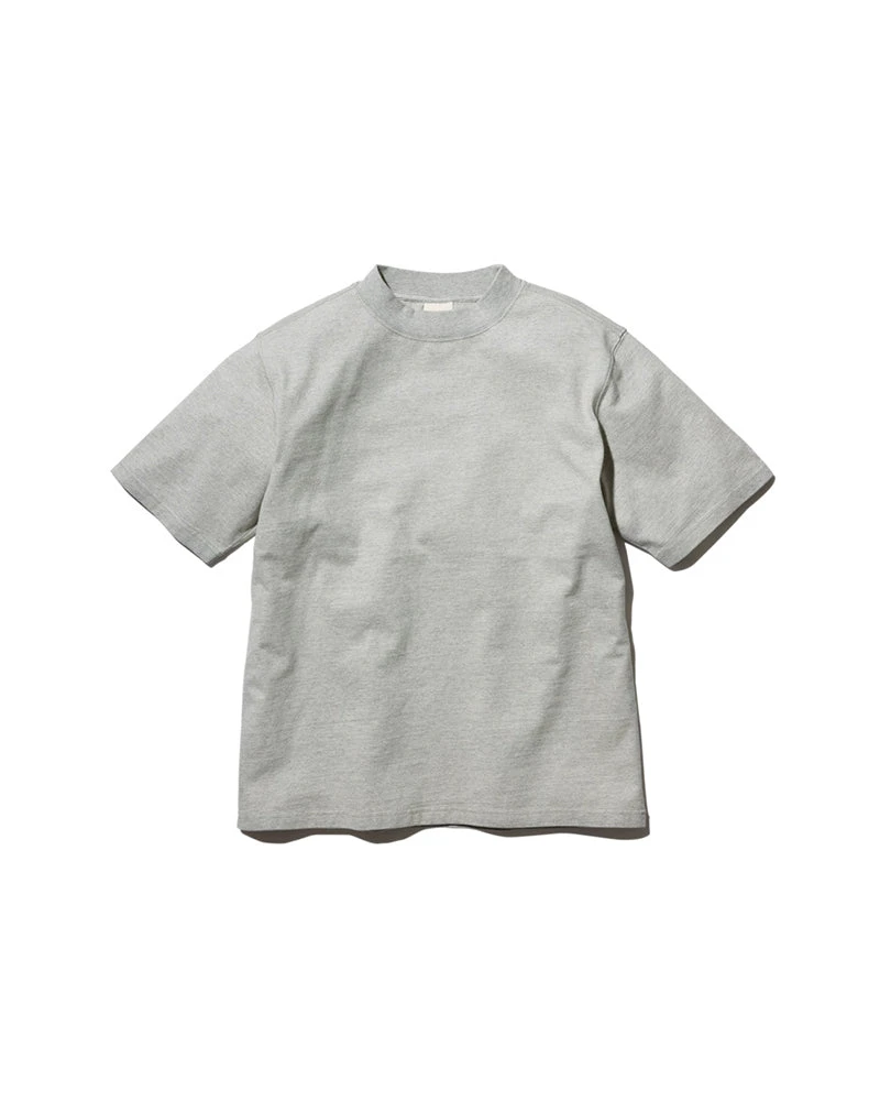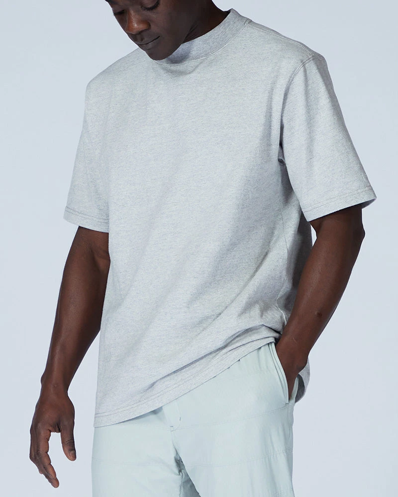 The Recycled Cotton Heavy Mockneck T-Shirt is a heavy-weight fabric mock neck shirt. The fabric is made of 100% durable cotton. The shirt features a mock neck and short sleeves.
