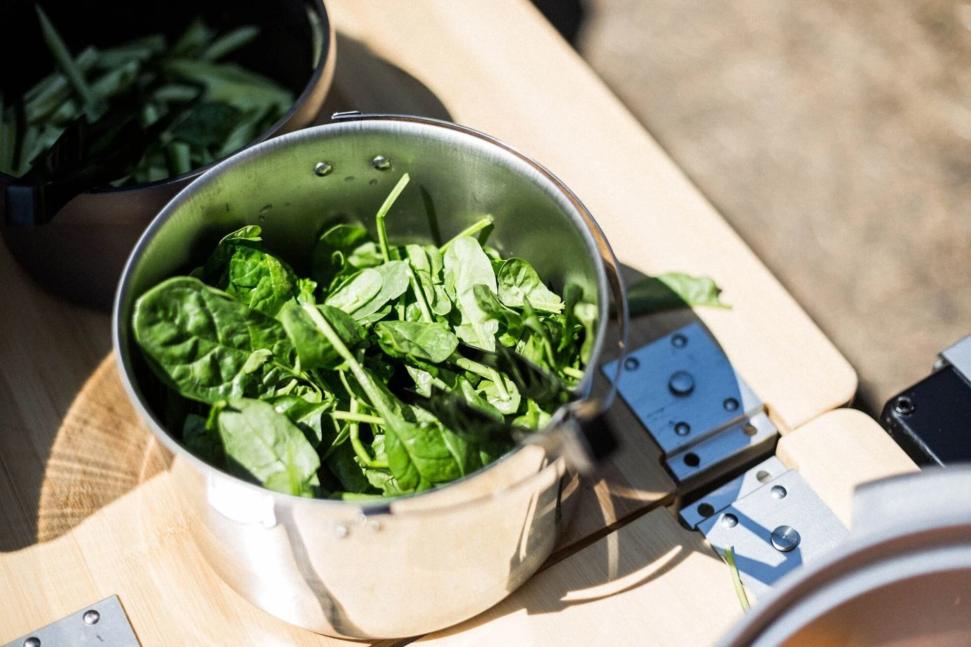 Designed in Japan, the Al Dente Set is made of polished stainless steel with wooden handles. Use the set on a stove or over a fire to cook for larger groups. The Al Dente Set includes two pots, two lids, and a mesh strainer. Pair the Al Dente Set with the