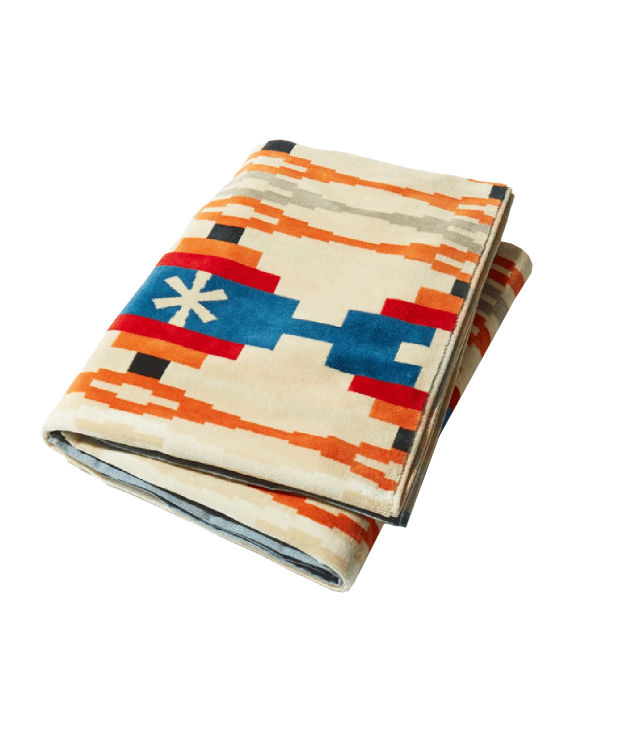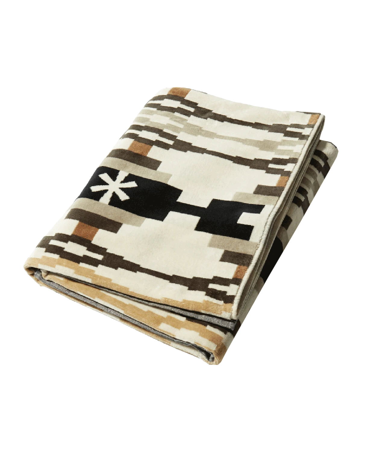 A collaboration with the legendary blanket maker, Pendleton Woolen Mills®, the SS23 SP x Pendleton Towel Blanket is a multifunctional accessory for home or the campfield. Crafted of thick loopback cotton, the unique pattern features hidden Snow Peak gear items and displays in a distinct colorway on either side. The absorbent fabric is great as a beach or river towel, while the ultrasoft feel provides warmth and comfort as a blanket.