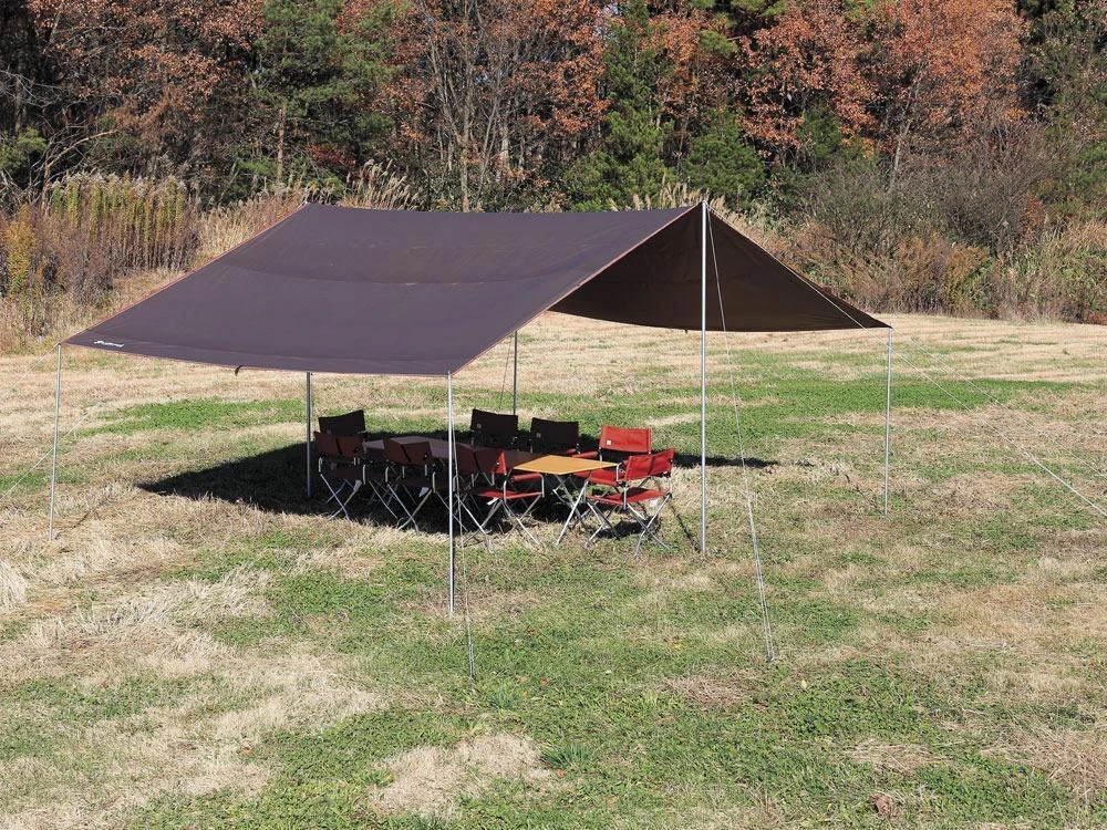 The Japanese-designed Recta Tarp HD Pro. Set in Large includes the large Recta Tarp and all required pieces for set-up. Use the eight person tarp for larger outdoor gatherings, regardless of season. The HD construction is engineered to more efficiently channel rainfall and withstand wind pressure. Shield processing applied to the fabric provides additional UV protection and shading, that can feel 2-4 degrees cooler than tarps without. The Set includes Solid Stakes, Poles, Copper Head Peg Hammer and Carry Case.