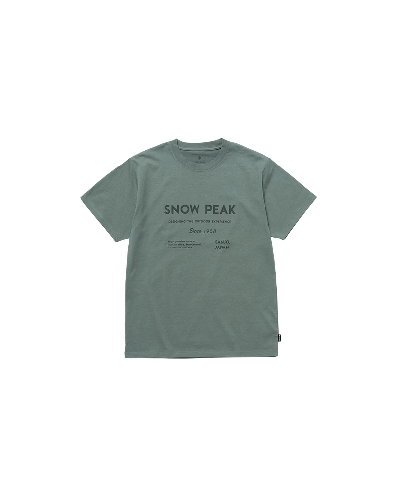 The SP Typography T-Shirt is short sleeved top. The shirt is made of recycled polyester and organic cotton. The SP Typography T-Shirt features a crew neck, short sleeves, a Snow Peak graphic on the chest, and a straight hem.