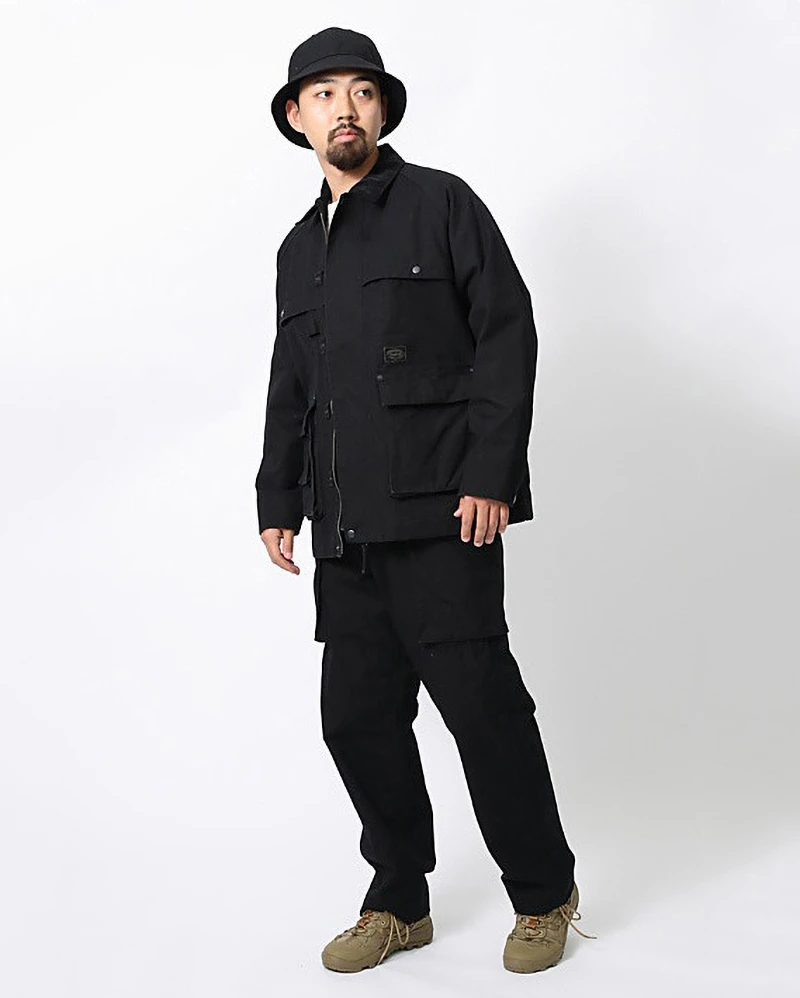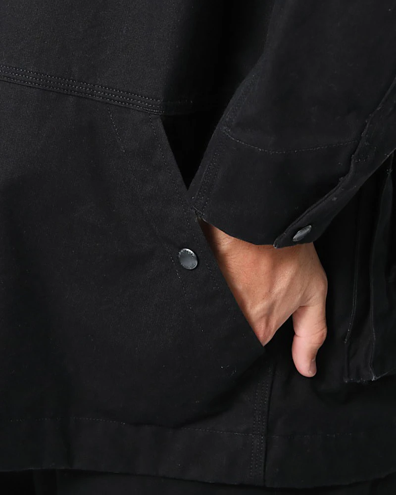 The Takibi Canvas Jacket is designed with a loose fit with the hem hitting below the waist. We recommend taking your normal size for a loose fit. The model stands 6′ and wears size L.