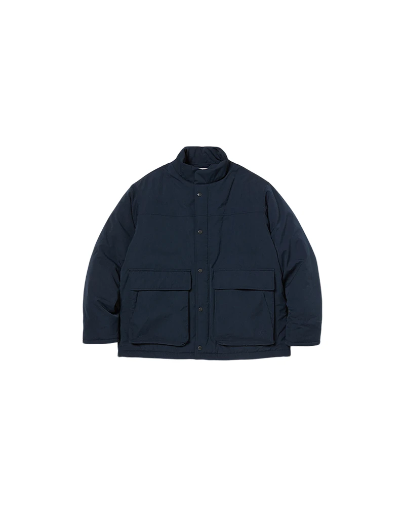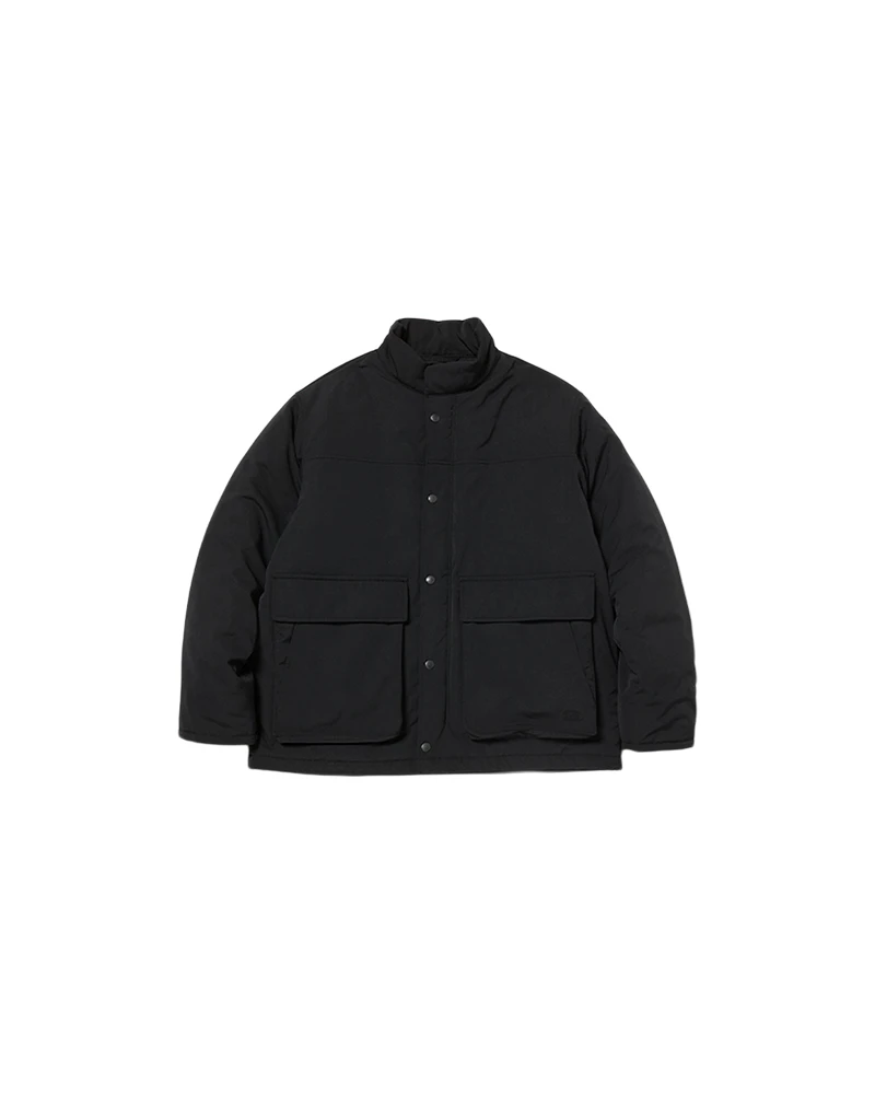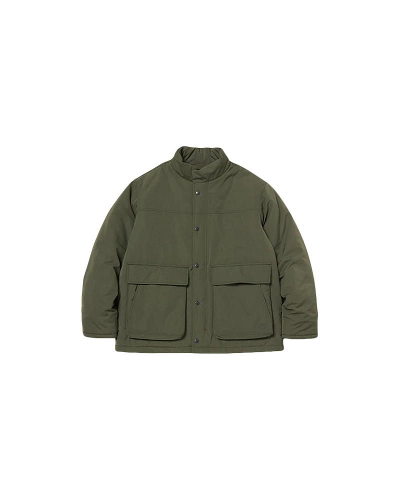 The Takibi Weather Padded Jacket is an insulated, fire-resistant jacket. The jacket features a zippered and buttoned front, a stand collar, two flap pockets on the front, and two angled pockets on the back. Additional features include elastic cuffs and a drawcord at the hem for increased heat retention.
