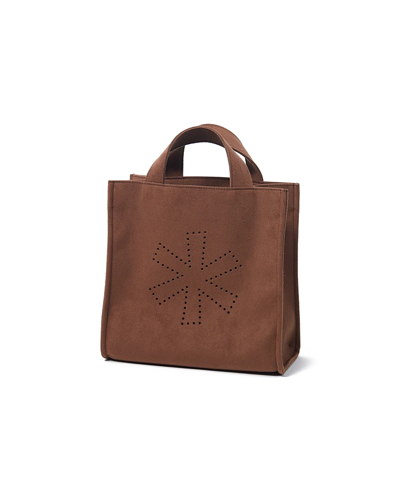 The Vegan Leather Mini Tote Bag is a durable, outdoor handbag that can be used daily or when camping. The bag features handles, a flat bottom, and a perforated asterisk logo. The material has a soft, suede-like feel, and is made partially from recycled and plant-based polyester. The material is washable, light-resistant and heat-resistant, making it ideal for outdoor activities.