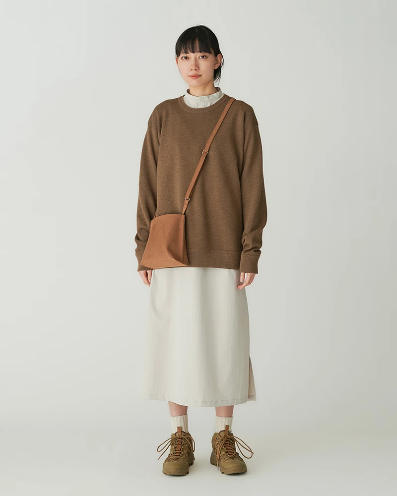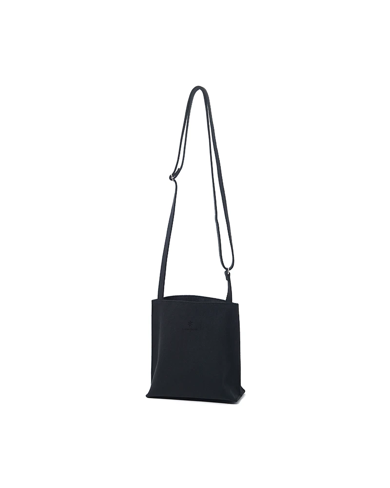 The Vegan Leather Shoulder Bag is a durable, outdoor sling bag that can be used daily or when camping. The bag features an adjustable shoulder strap, a flat bottom, and an embossed Snow Peak logo. The material has a soft, suede-like feel, and is made partially from recycled and plant-based polyester. The material is washable, light-resistant, and heat-resistant, making it ideal for outdoor activities.