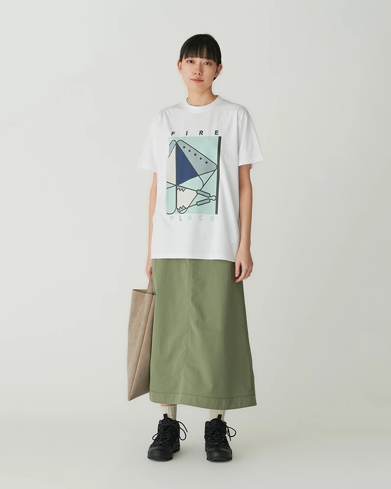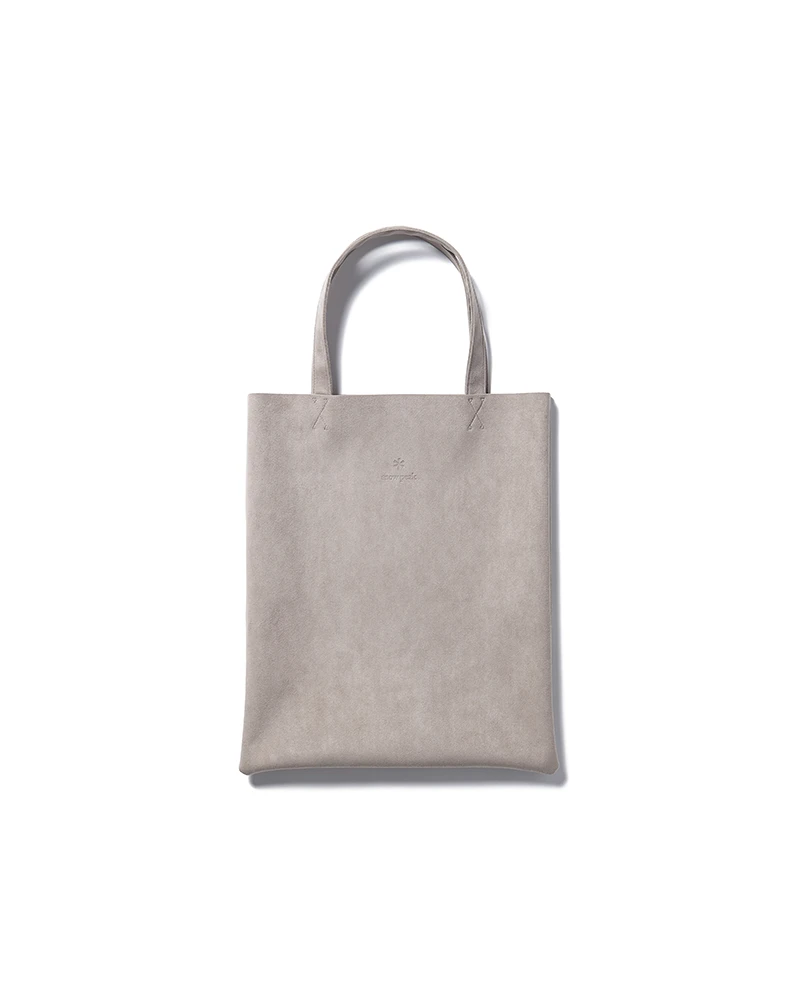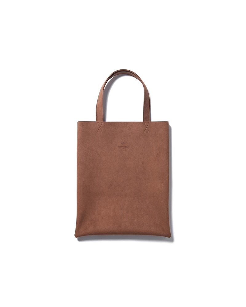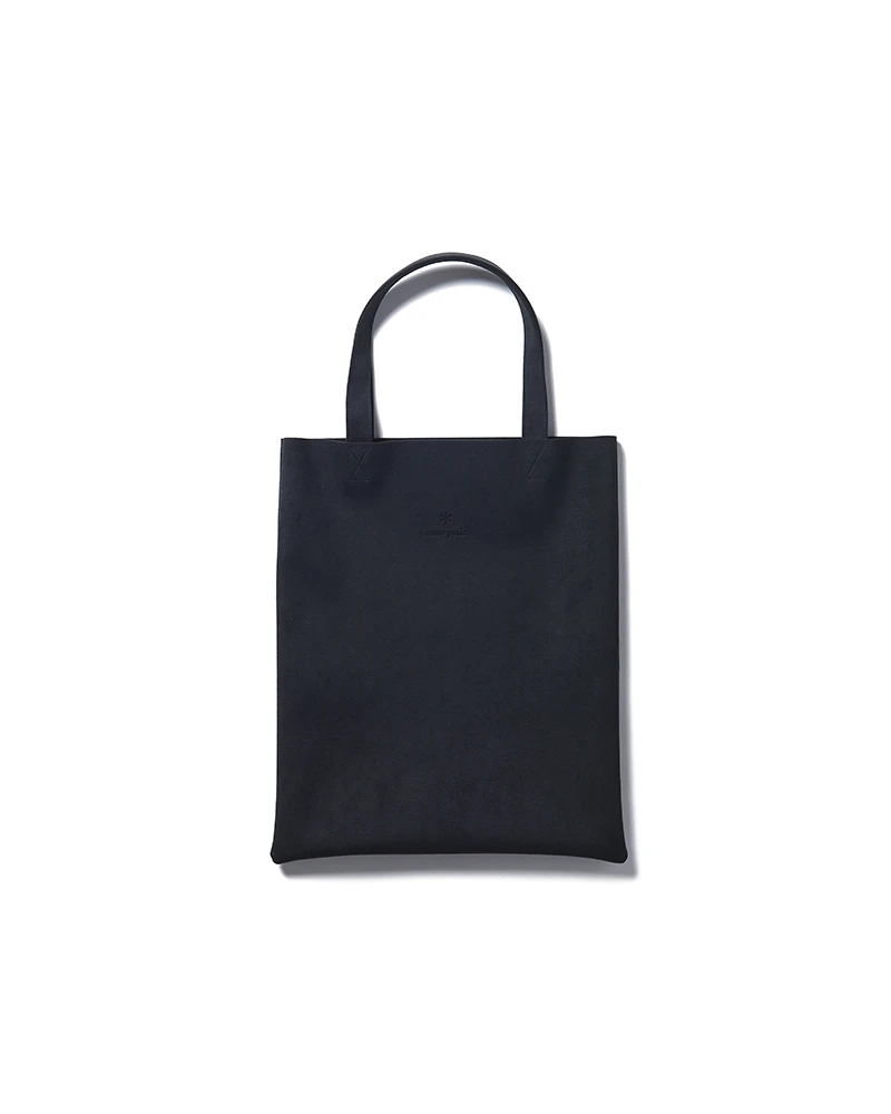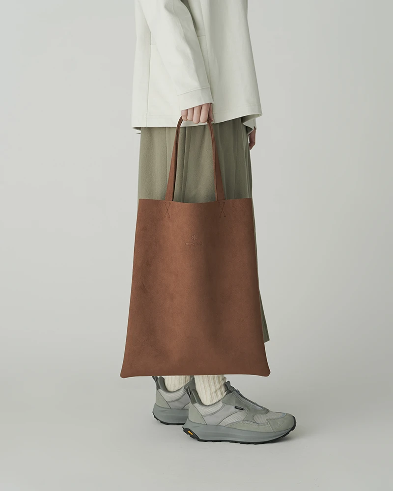 The Vegan Leather Tote Bag is a durable, outdoor shoulder bag that can be used daily or when camping. The bag features handles, a slim profile, and an embossed Snow Peak logo. The material has a soft, suede-like feel, and is made partially from recycled and plant-based polyester. The material is washable, light-resistant and heat-resistant, making it ideal for outdoor activities.